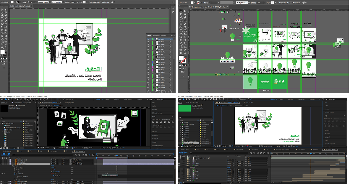 Illustrator files were organized and prepped for animation. The frames were then animated in Adobe After Effects, bringing movement to characters and elements.