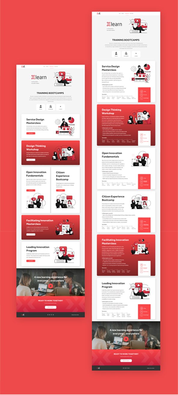 Revamped the XLearn Academy section to highlight TAMx’s educational offerings — including masterclasses, courses, and workshops. Programs covered specialized topics like Service Design, Open Innovation, Citizen Experience Design, Facilitation, and Innovation Leadership, aiming to empower professionals and organizations through targeted upskilling.